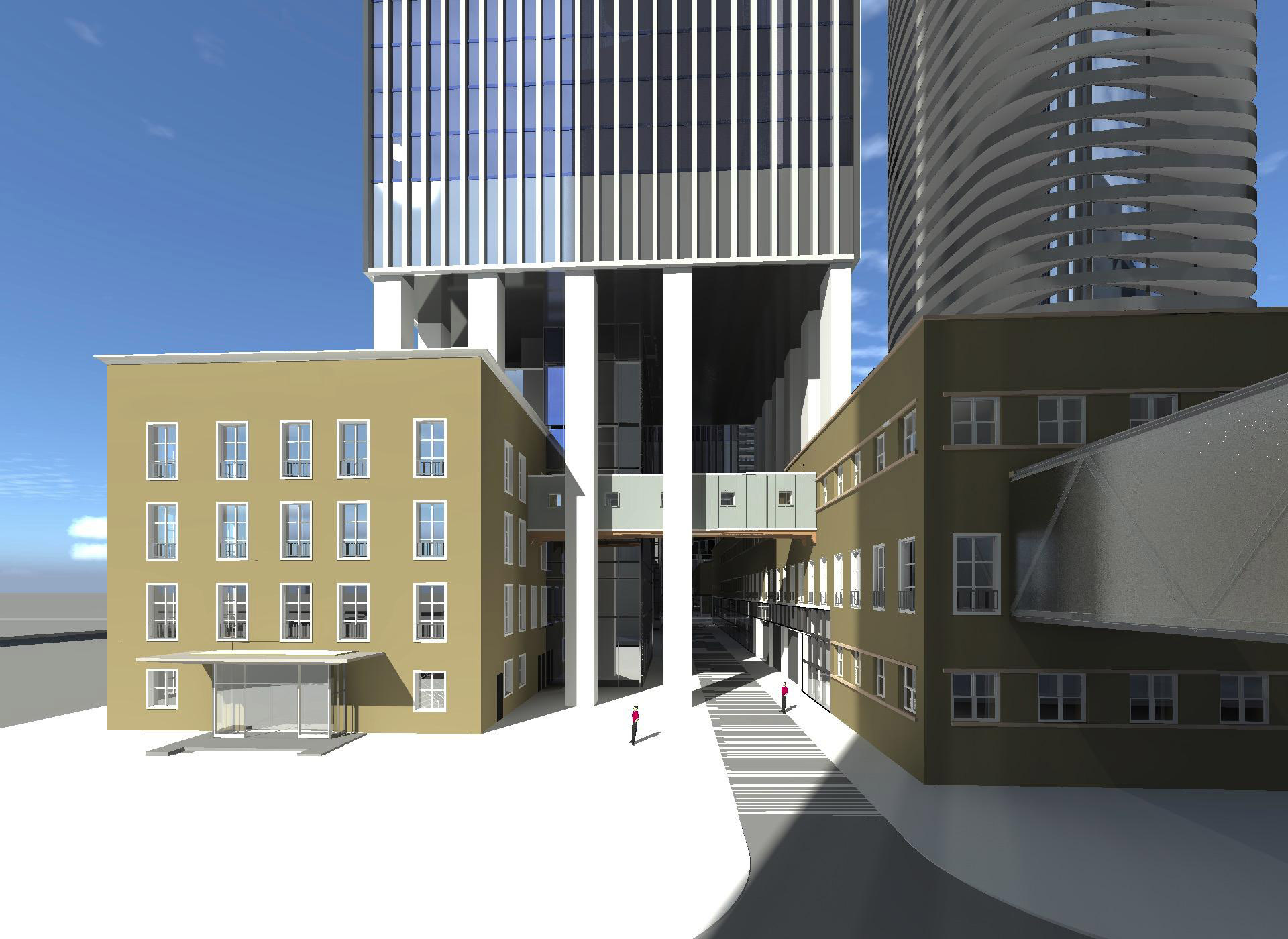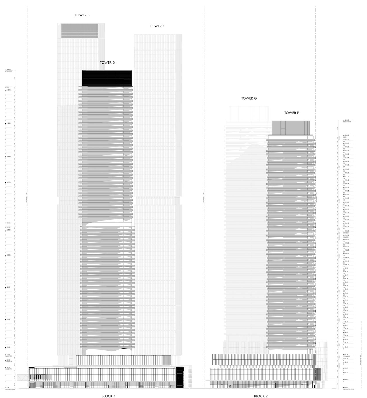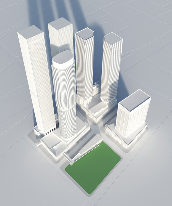 It will have a 24-storey, 642,000 ft2 commercial tower, two 67-storey residential towers with a 9-storey podium containing ground floor retail and a combined GFA of 1,100,000 ft2, four residential towers (62, 67, 72, and 77 storeys) with an 8-storey podium, and a combined GFA of 2,500,000 ft2, and a 3-storey, 50,500 ft2 parking area.